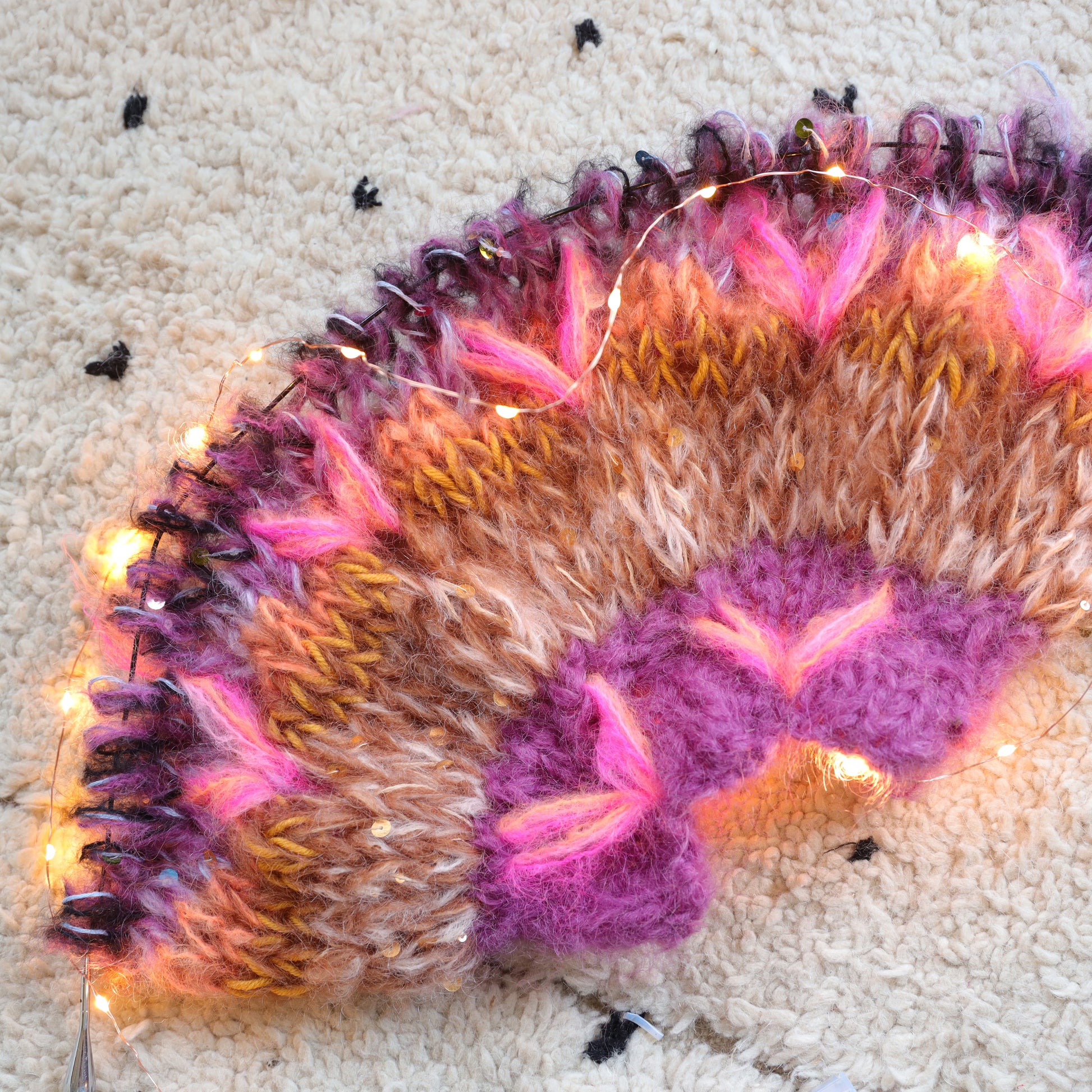 It’s very light, warm and comfortable. This kit contains MYPZ Chunky Kidmohair DK, a high quality fine brushed mohair that does not pill. These brushed yarns may shed a little but after a while this will subside.
