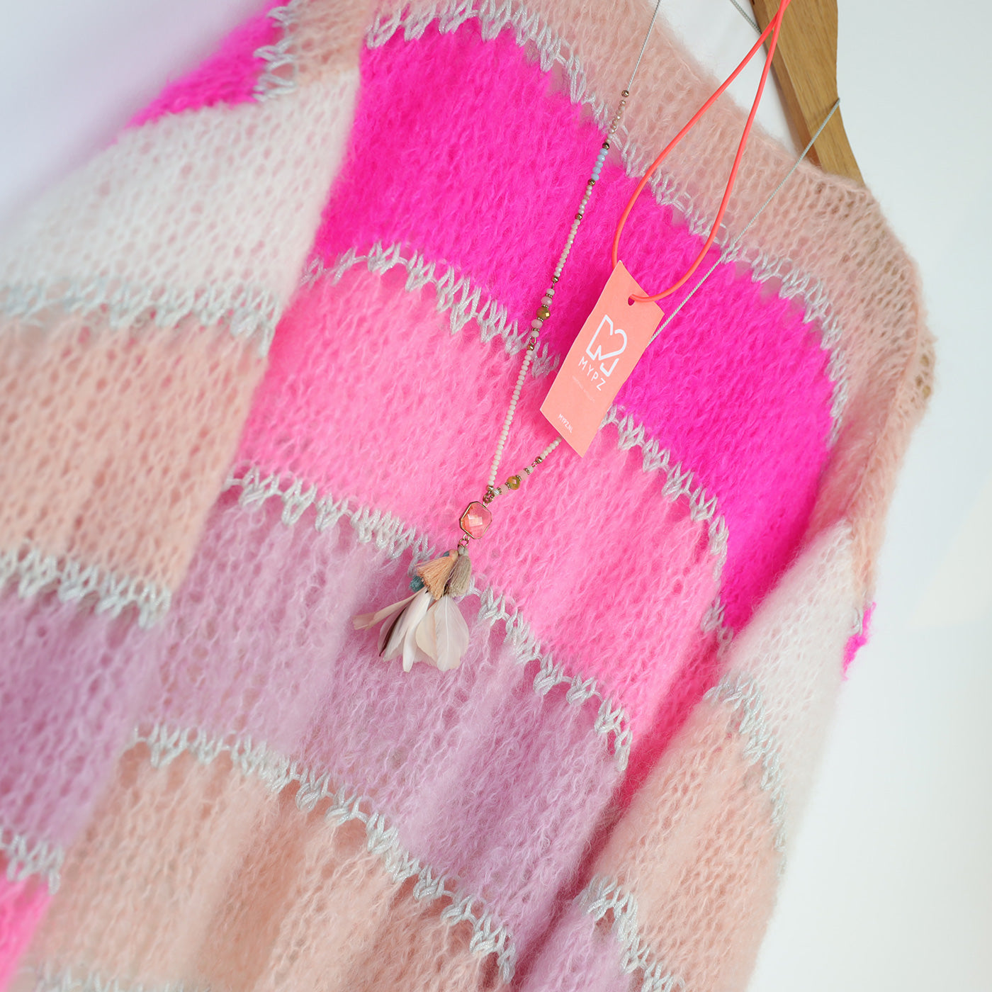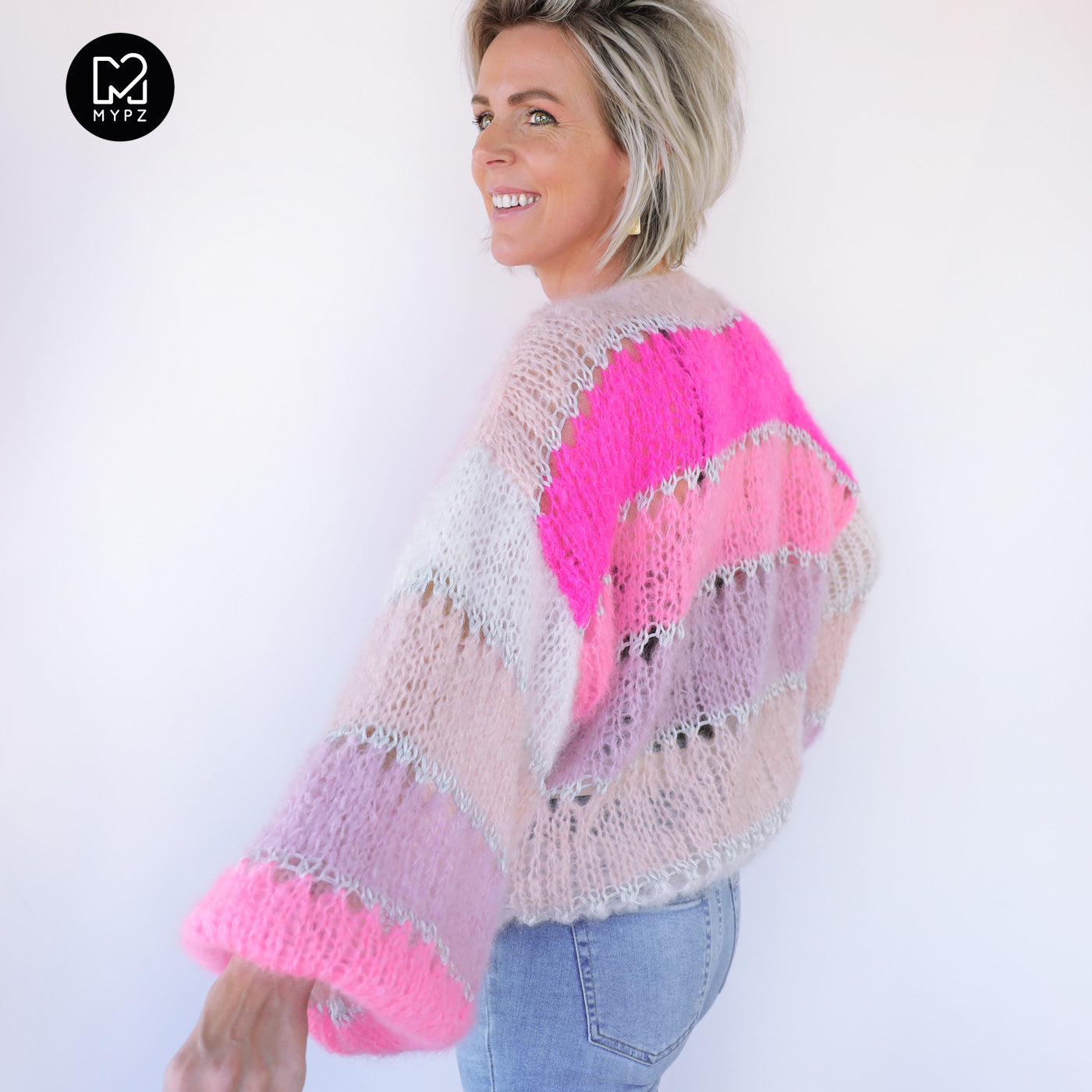 For this model we knit with 1 strand Mypz Chunky Kidmohair dk. We have used 2 strands MYPZ Sparkle Merino for the striping.