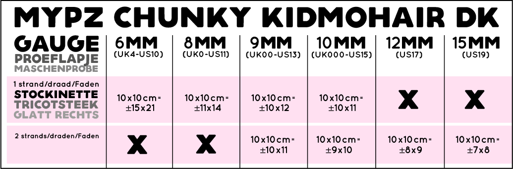 For our Basic Chunky mohair pullover you need: ± 800 meter MYPZ Chunky Kidmohair DK (+100m M/L) (+200m XL/XXL)
