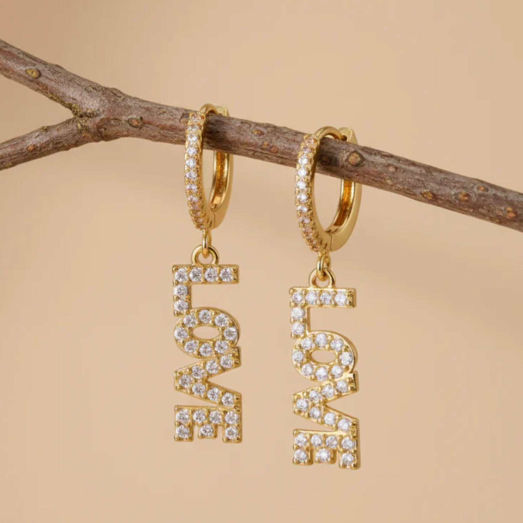 These elegant gold hoops are set with sparkling zirconia stones and feature a charming LOVE design that glimmers with every movement. The perfect statement piece for anyone who loves to radiate love and style – day and night.